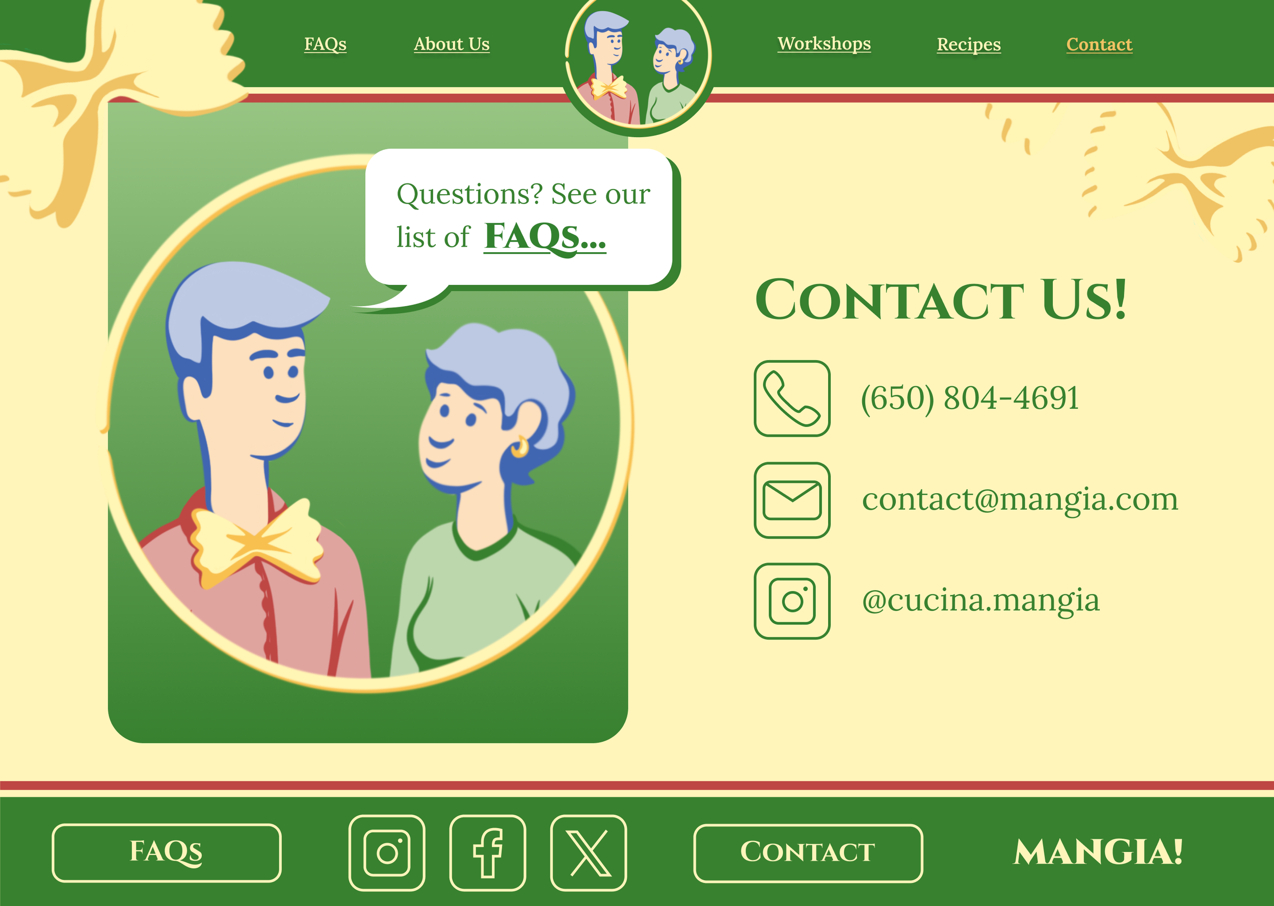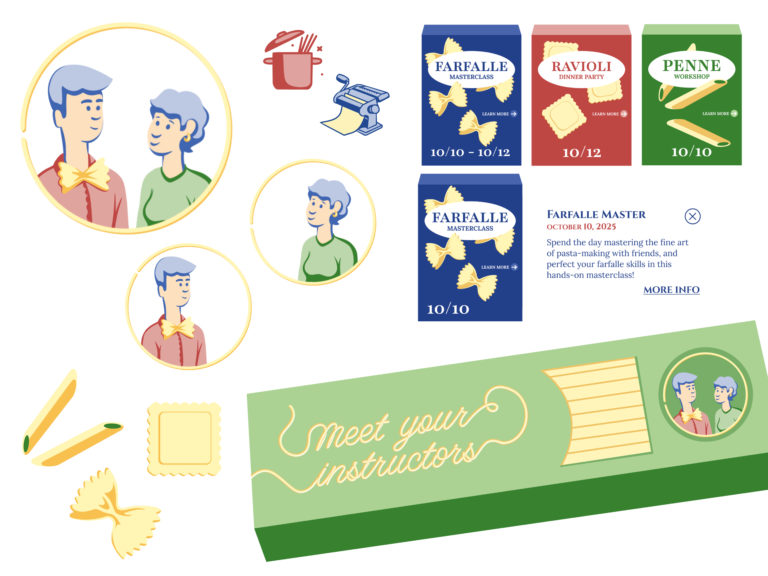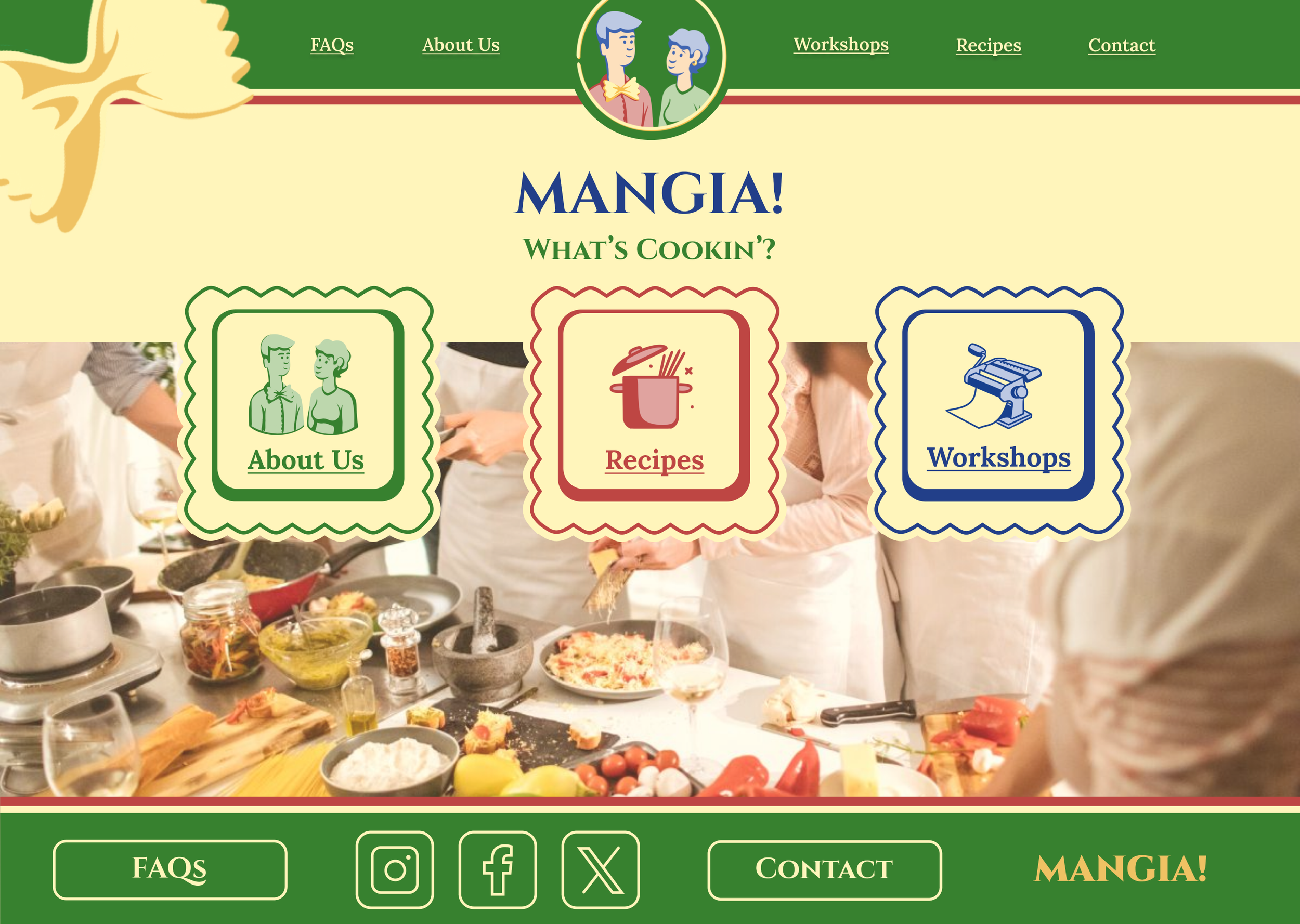 The challenge was to develop a cohesive brand identity, custom typography, and website for a workshop of my choice. I created MANGIA, a fictional pasta-making class hosted by my parents to showcase their Italian heritage and culinary expertise.